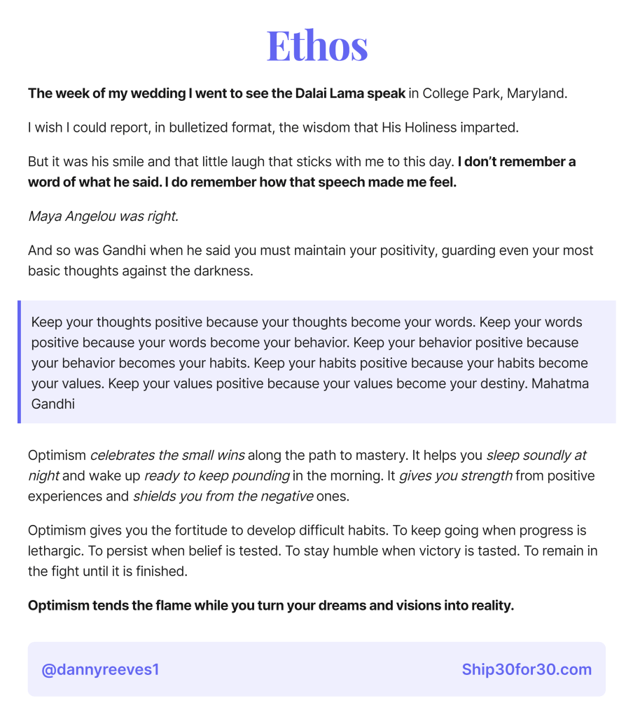 Optimism celebrates the small wins along the path to mastery. It helps you sleep soundly at night and wake up ready to keep pounding in the morning. It gives you strength from positive experiences and shields you from the negative ones.