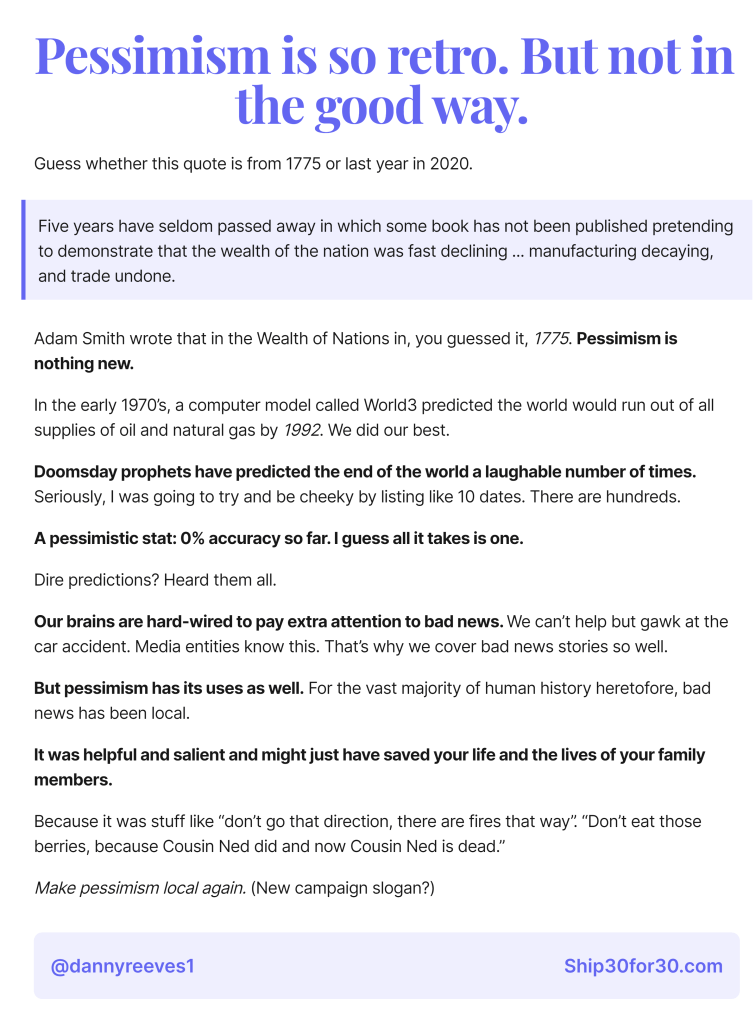 But pessimism has its uses as well. For the vast majority of human history heretofore, bad news has been local.
