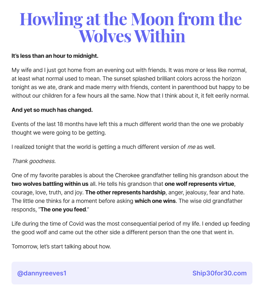 Life during the time of Covid was the most consequential period of my life. I ended up feeding the good wolf and came out the other side a different person than the one that went in.