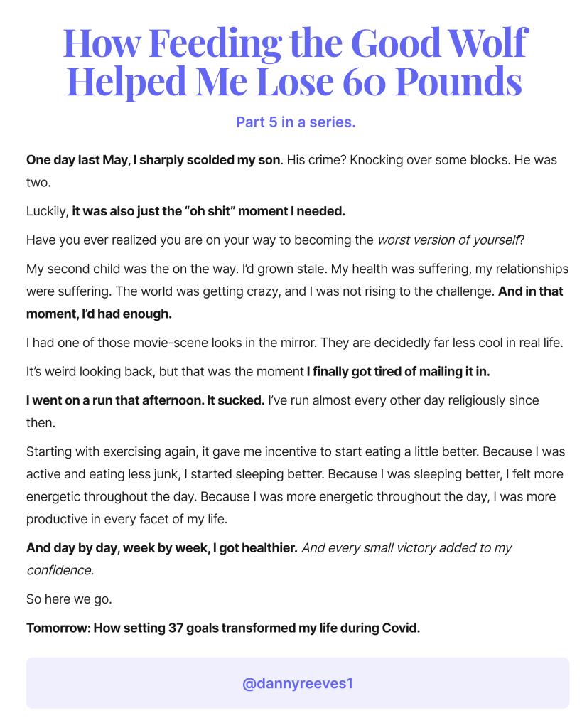 Starting with exercising again, it gave me incentive to start eating a little better. Because I was active and eating less junk, I started sleeping better. Because I was sleeping better, I felt more energetic throughout the day. Because I was more energetic throughout the day, I was more productive in every facet of my life.