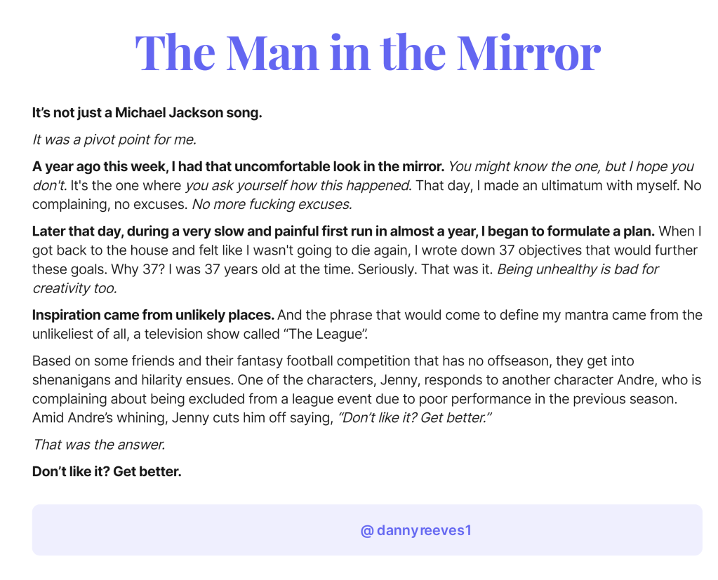 A year ago this week, I had that uncomfortable look in the mirror. You might know the one, but I hope you don’t. It’s the one where you ask yourself how this happened. That day, I made an ultimatum with myself. No complaining, no excuses. No more fucking excuses.