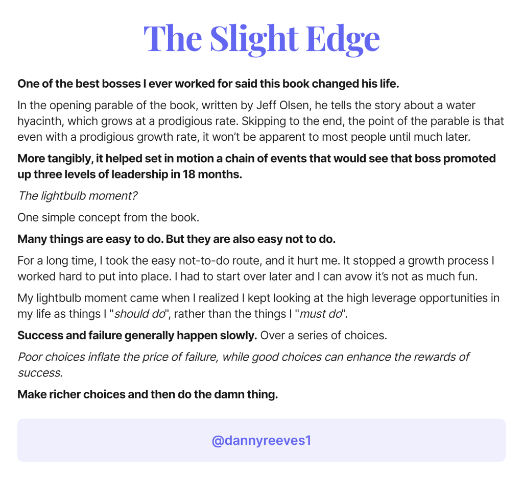 My lightbulb moment came when I realized I kept looking at the high leverage opportunities in my life as things I “should do“, rather than the things I “must do“.
