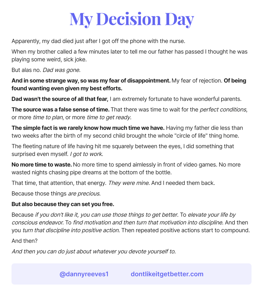 Because if you don’t like it, you can use those things to get better. To elevate your life by conscious endeavor. To find motivation and then turn that motivation into discipline. And then you turn that discipline into positive action. Then repeated positive actions start to compound.