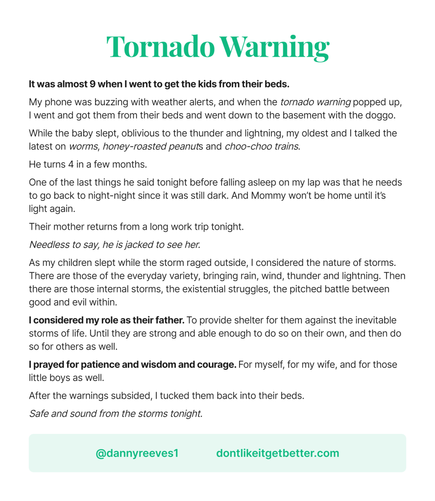 My phone was buzzing with weather alerts, and when the tornado warning popped up, I went and got them from their beds and went down to the basement with the doggo.