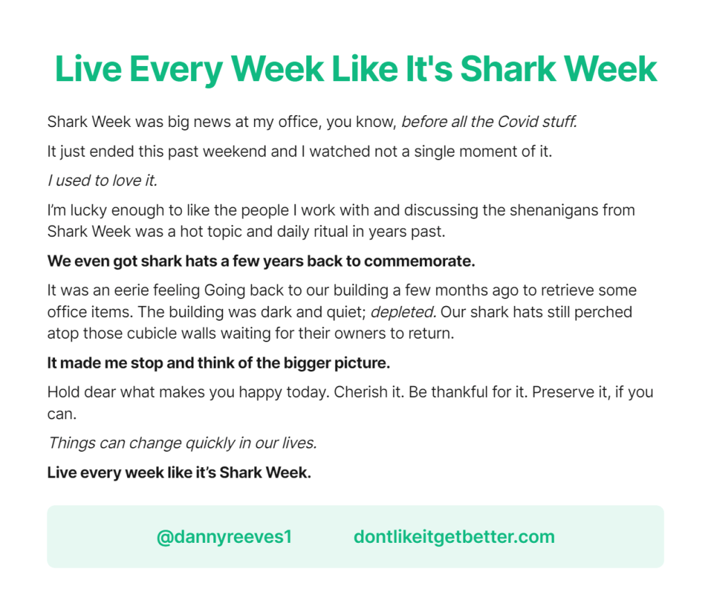 I’m lucky enough to like the people I work with and discussing the shenanigans from Shark Week was a hot topic and daily ritual in years past.