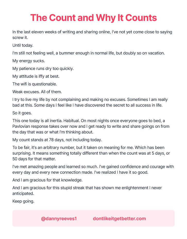 To be fair, it’s an arbitrary number, but it’s taken on meaning for me. Which has been surprising. It means something totally different than when the count was at 5 days, or at 50 days for that matter.