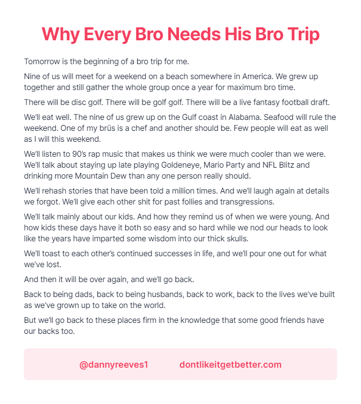 Nine of us will meet for a weekend on a beach somewhere in America. We grew up together and still gather the whole group once a year for maximum bro time.