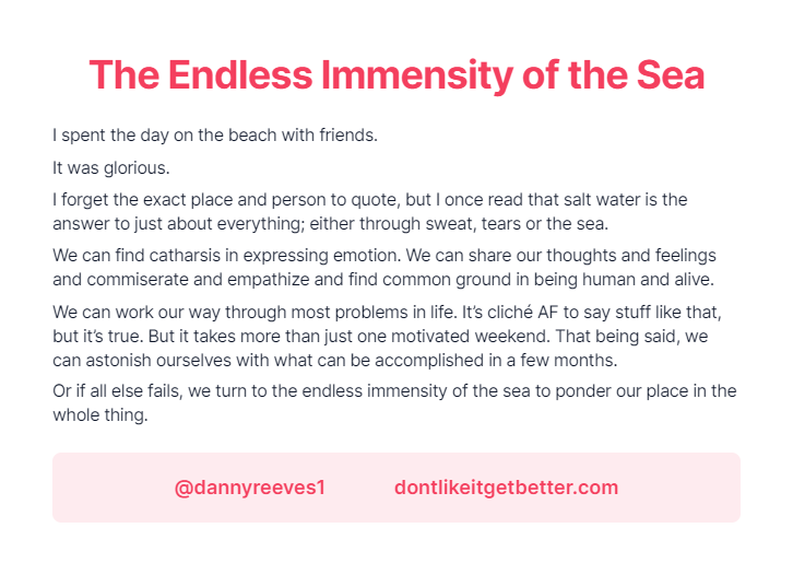 Or if all else fails, we turn to the endless immensity of the sea to ponder our place in the whole thing.