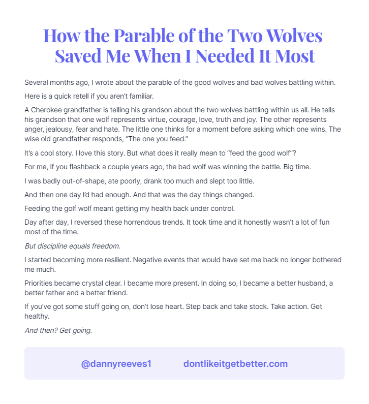 Several months ago, I wrote about the parable of the good wolves and bad wolves battling within.