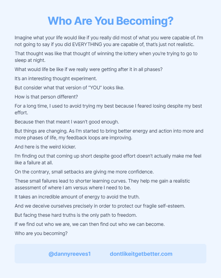 Imagine what your life would like if you really did most of what you were capable of. I’m not going to say if you did EVERYTHING you are capable of, that’s just not realistic.