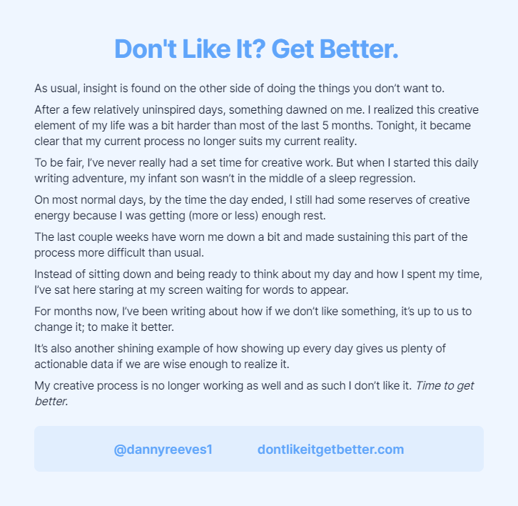 To be fair, I’ve never really had a set time for creative work. But when I started this daily writing adventure, my infant son wasn’t in the middle of a sleep regression.