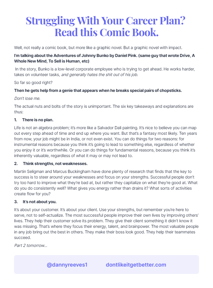 I’m talking about the Adventures of Johnny Bunko by Daniel Pink. (same guy that wrote Drive, A Whole New Mind, To Sell is Human, etc)