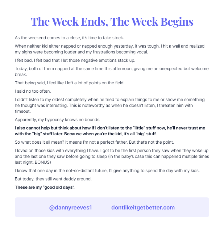 So what does it all mean? It means I’m not a perfect father. But that’s not the point.