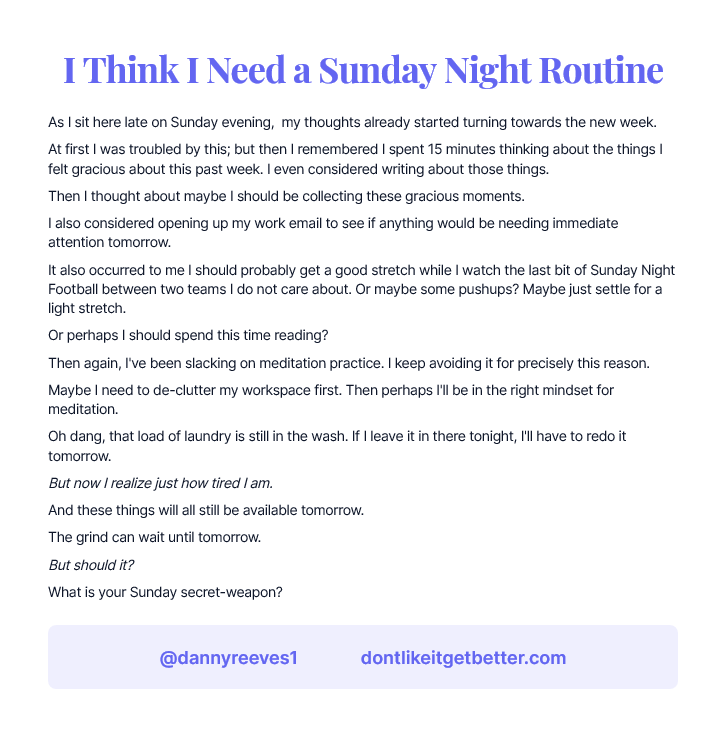 It also occurred to me I should probably get a good stretch while I watch the last bit of Sunday Night Football between two teams I do not care about. Or maybe some pushups? Maybe just settle for a light stretch.
