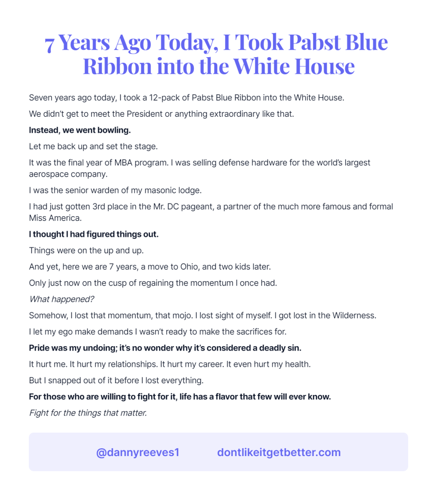 Seven years ago today, I took a 12-pack of Pabst Blue Ribbon into the White House.
