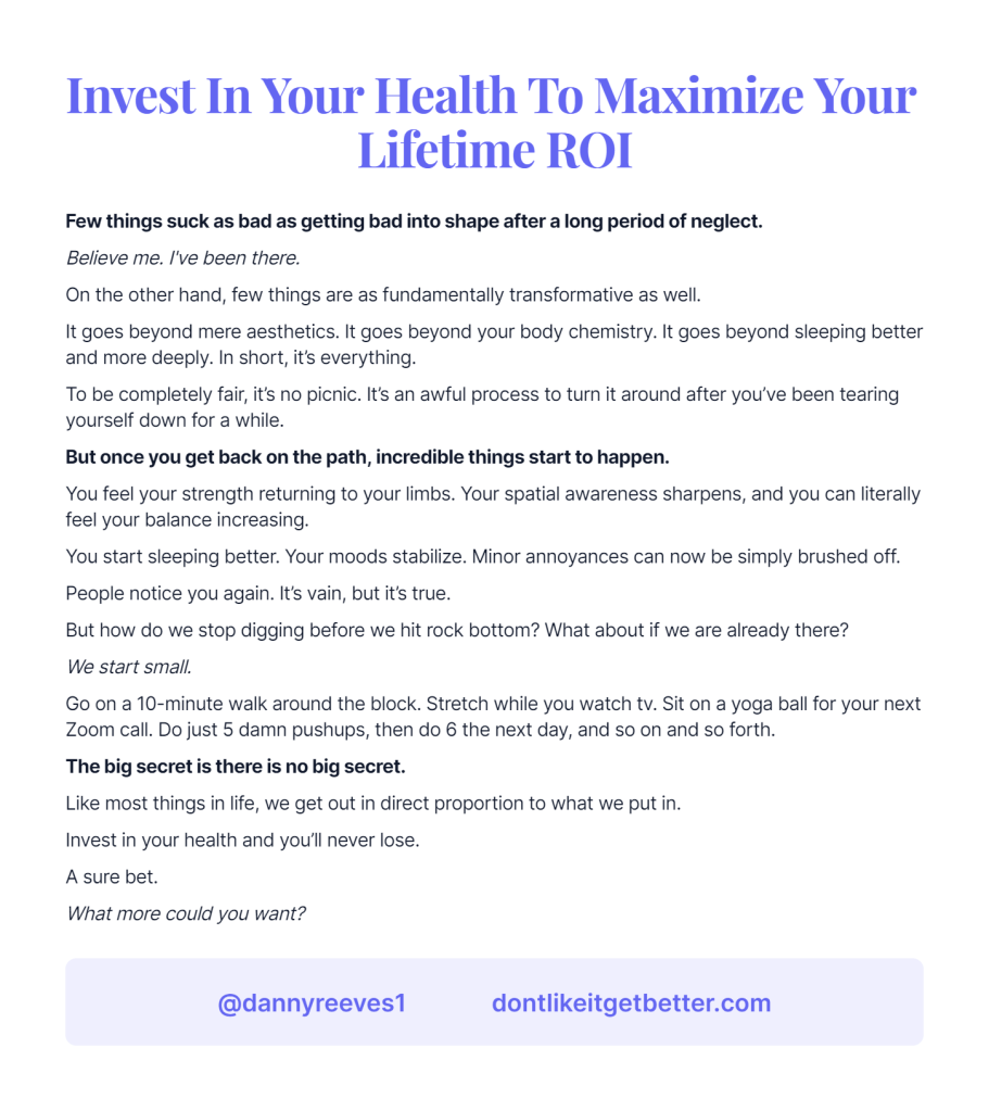 Go on a 10-minute walk around the block. Stretch while you watch tv. Sit on a yoga ball for your next Zoom call. Do just 5 damn pushups, then do 6 the next day, and so on and so forth.