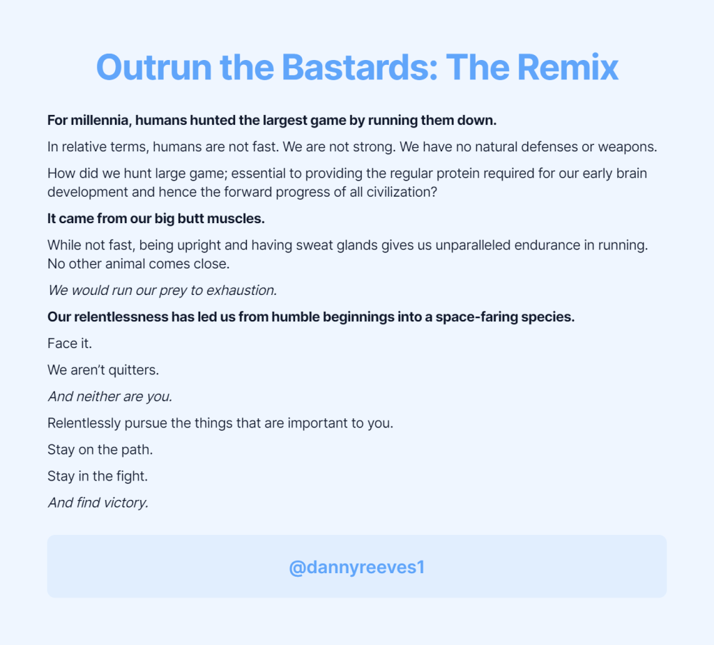 While not fast, being upright and having sweat glands gives us unparalleled endurance in running. No other animal comes close.