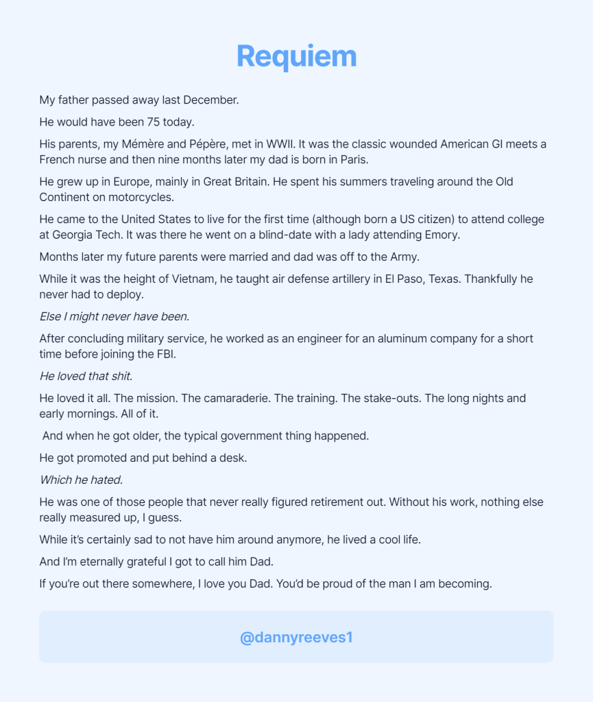 If you’re out there somewhere, I love you Dad. You’d be proud of the man I am becoming.