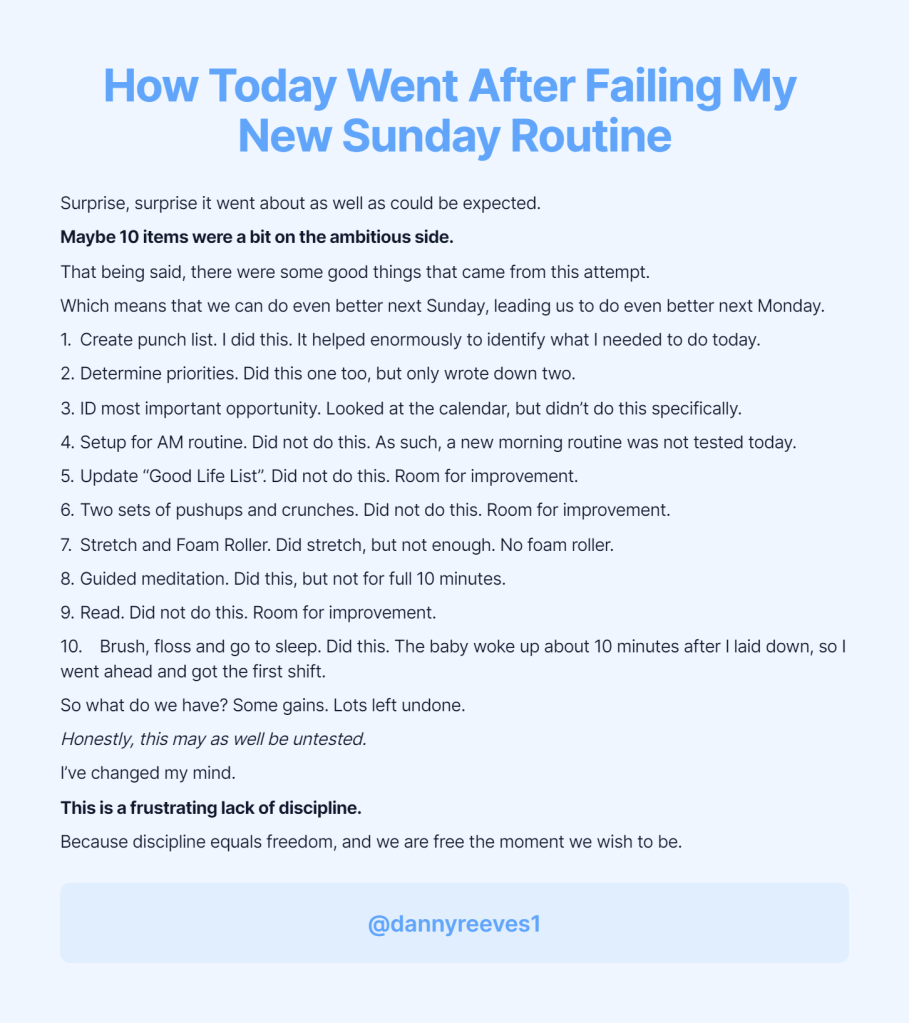 4. Setup for AM routine. Did not do this. As such, a new morning routine was not tested today.